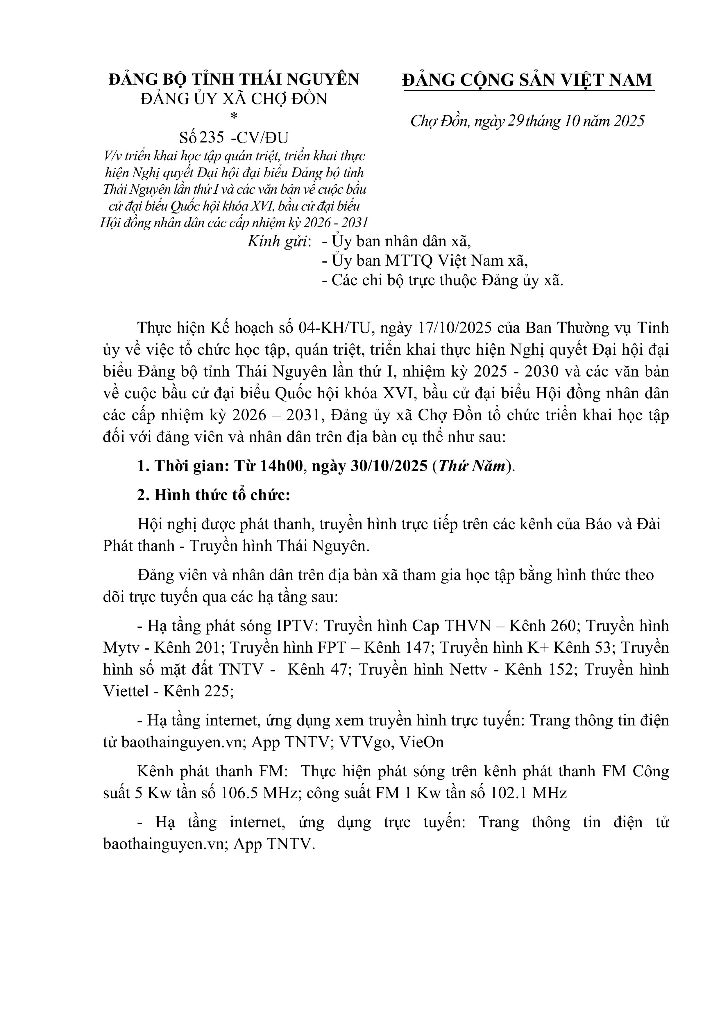 Triển khai học tập quán triệt, triển khai thực hiện Nghị quyết Đại hội đại biểu Đảng bộ tỉnh Thái Nguyên lần thứ I và các văn bản về cuộc bầu cử đại biểu Quốc hội khóa XVI, bầu cử đại biểu Hội đồng nhân dân các cấp nhiệm kỳ 2026 - 2031