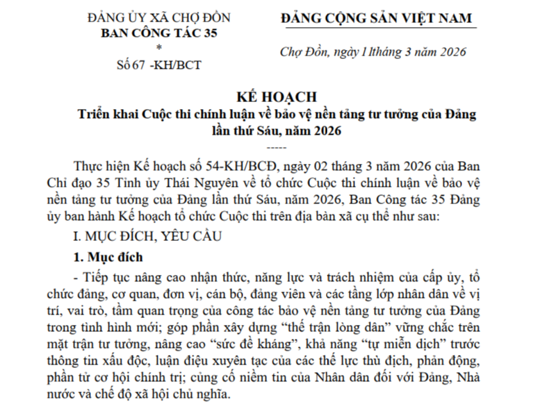 Thực hiện Kế hoạch của Ban Chỉ đạo 35 Tỉnh ủy Thái Nguyên, Ban Công tác 35 Đảng ủy xã Chợ Đồn đã ban hành kế hoạch triển khai Cuộc thi chính luận về bảo vệ nền tảng tư tưởng của Đảng lần thứ Sáu, năm 2026 trên địa bàn toàn xã